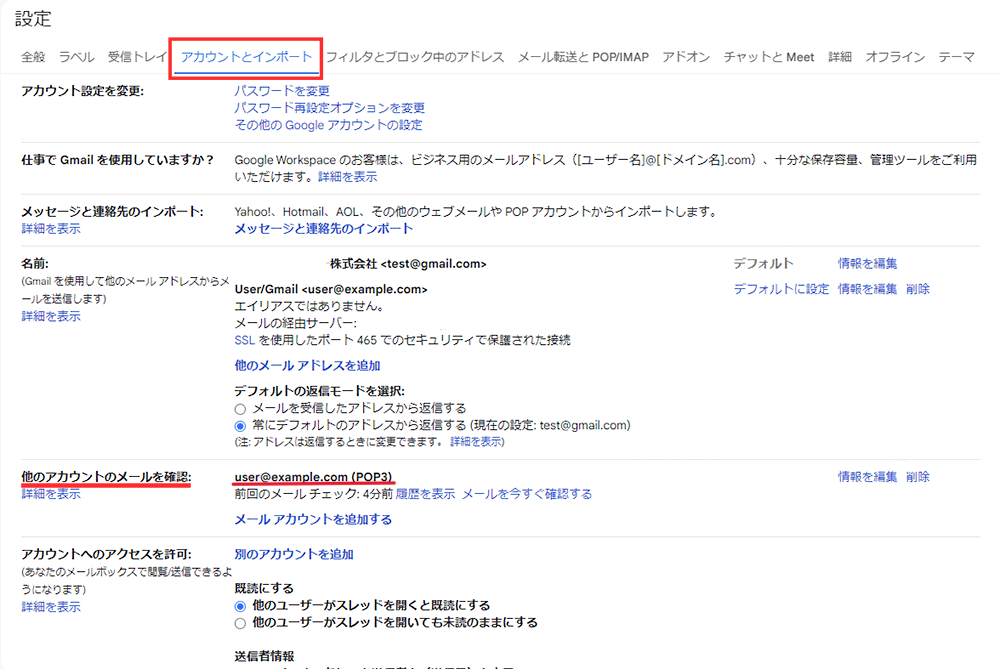 ブラウザ版Gmailで外部メールの取り込み(POP受信)機能を利用しているかどうかは下記の手順でご確認ください。